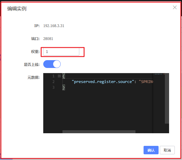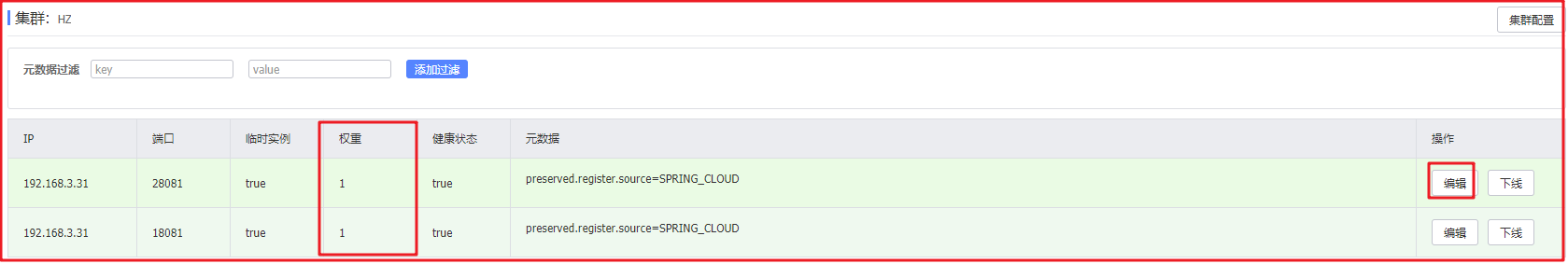 在nacos控制台,找到user-service的实例列表,点击编辑,即可修改权重:
